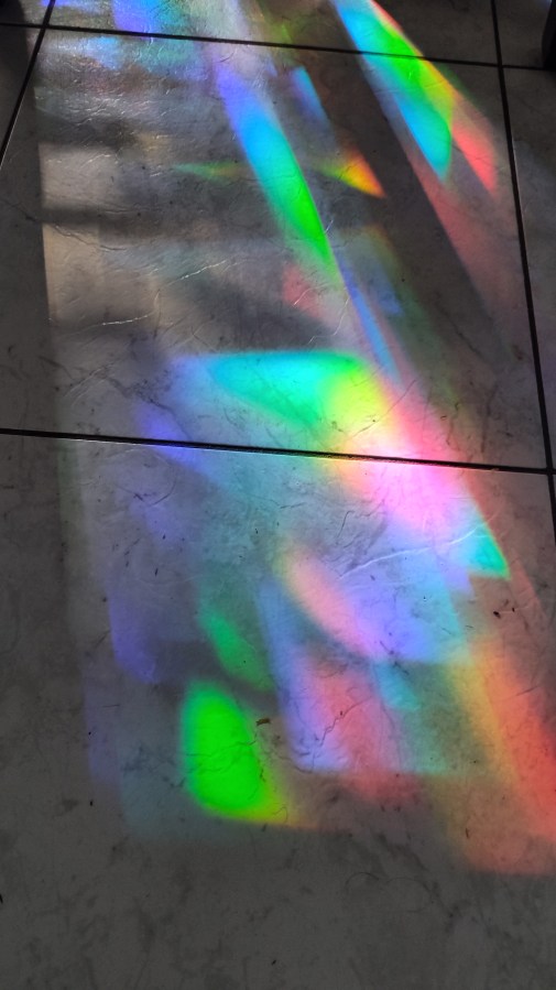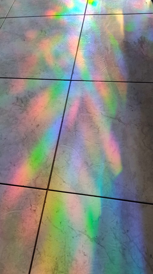 I love color and of course whenever I see a rainbow I can’t help but get excited. I purchased a rainbow cling from Amazon and my inner child is very happy! As the sun sets beyond my kitchen window, rainbows are thrown across anything that catches the sunlight and it always makes me smile.